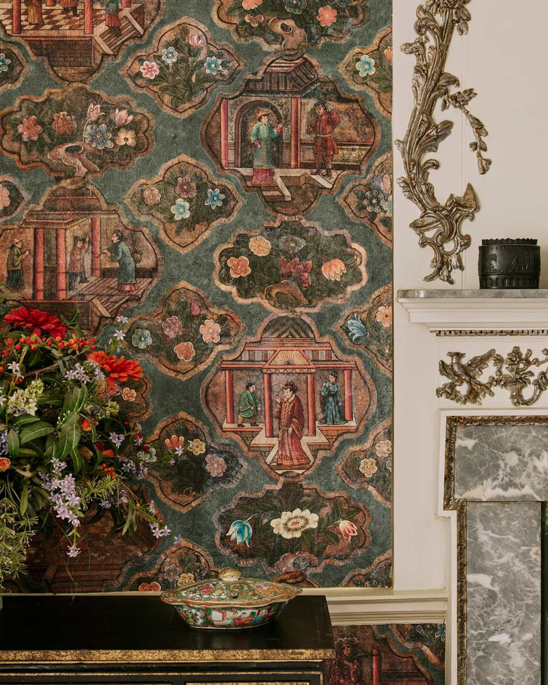 Zeroing in on specific botanical elements of the Chinoiserie in Queen Marys bedroom, Queen Mary & Friends delivers digitally printed motifs in punched up, contemporary colours.