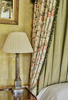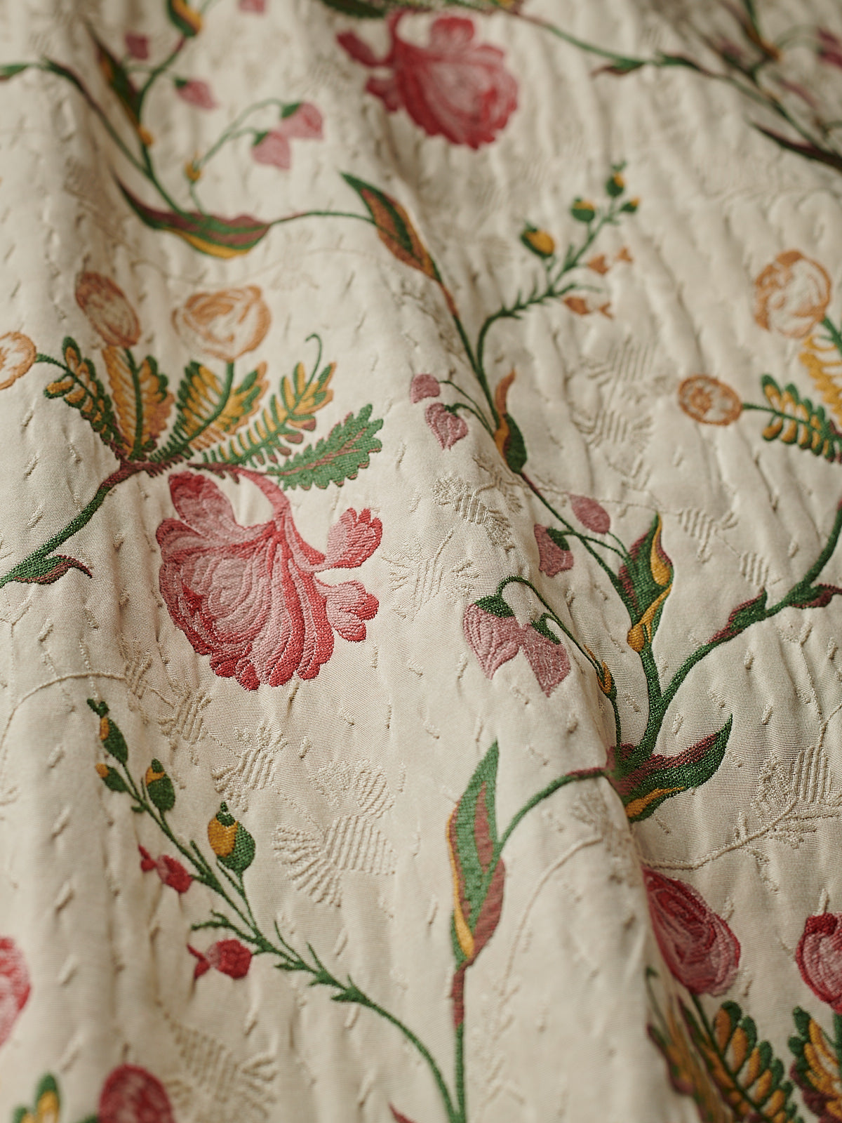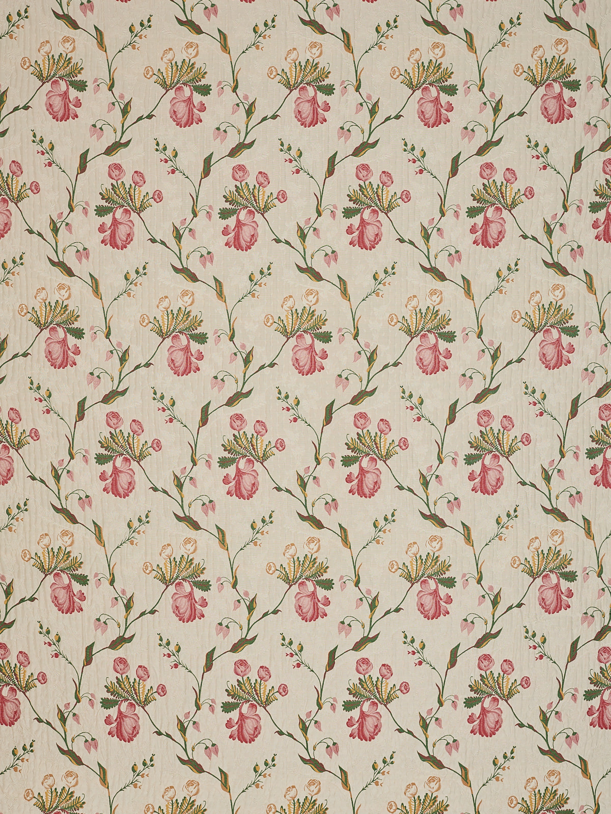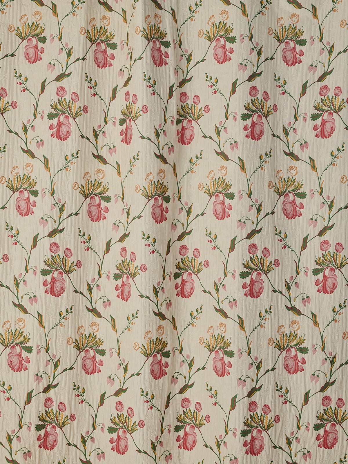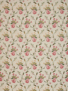 Dainty flowers and foliage ascend the pale ground of this elegant fabric. Unfurled blooms and tightly drawn buds punctuate the fabric in a graceful fashion, as vigorous shoots and stems scaffold the design. Radiating innocence and vitality, this silk truly captures the purity of the Garden of Eden.