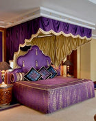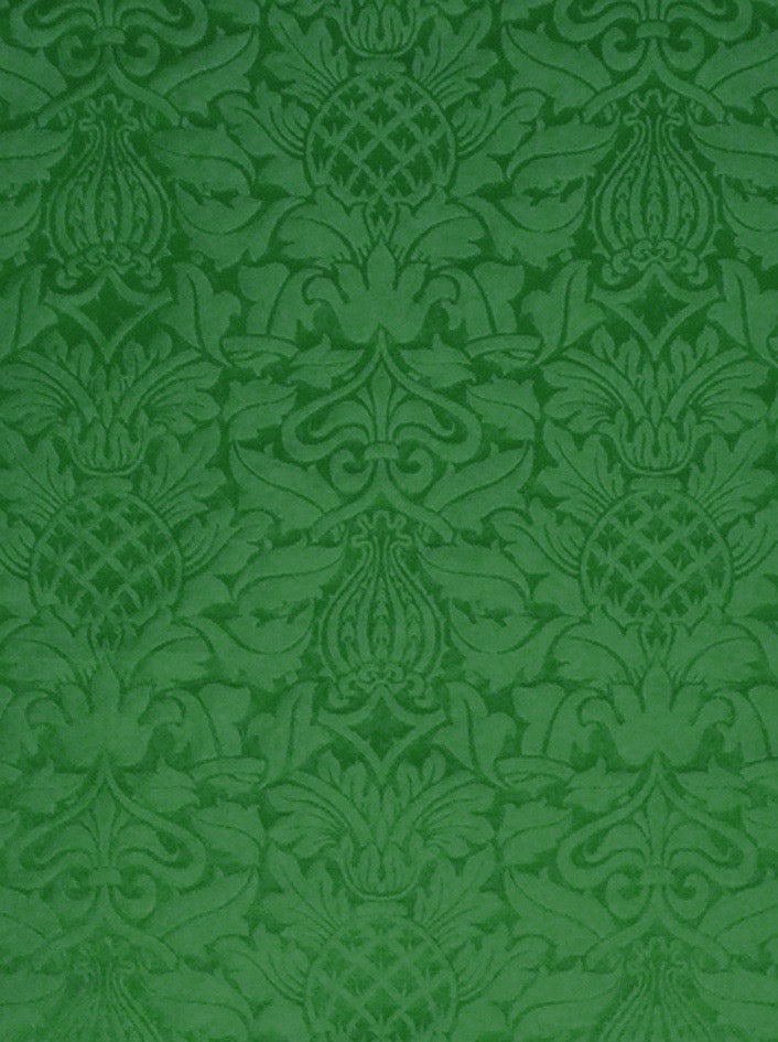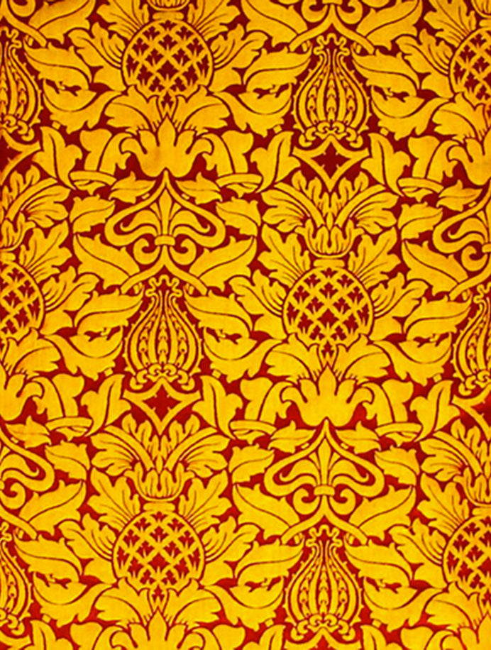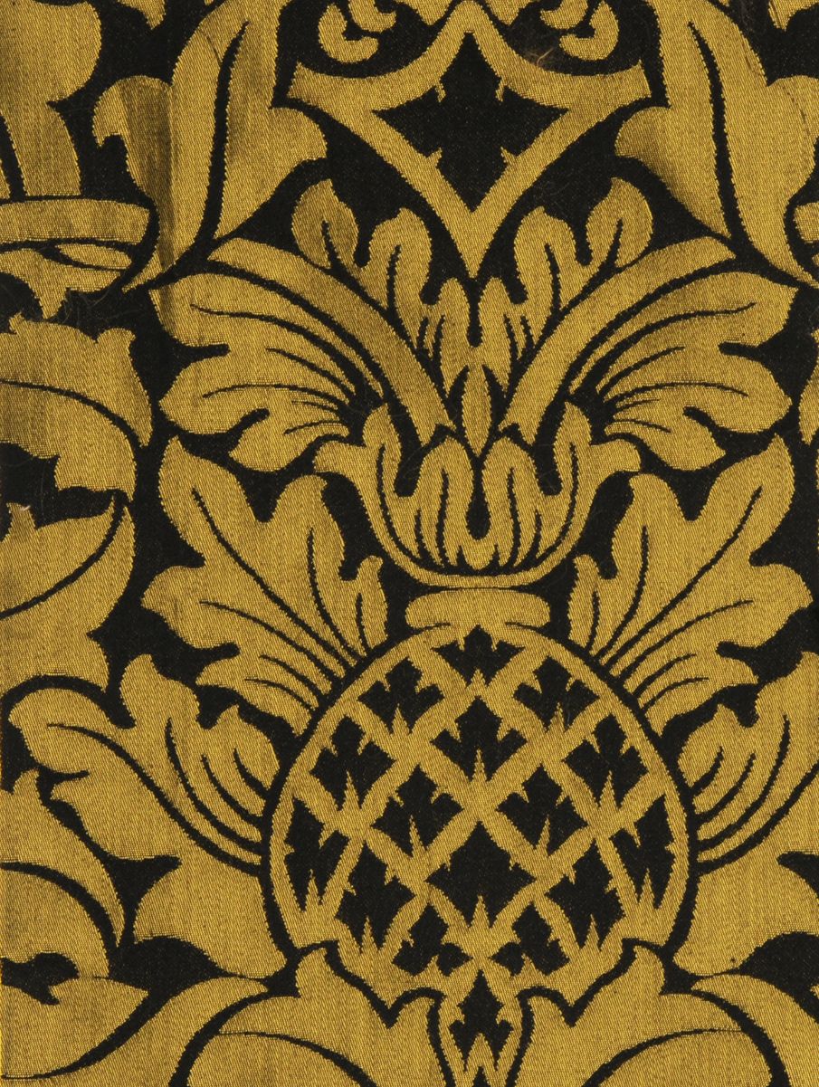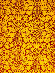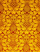 c.1868 From the Watts Chancery Collection of rich decorative brocades, damasks and tapestries that reflect the influence of both European and Eastern designs of earlier centuries, this Victorian Gothic fabric is distinctive and dramatic. Designed by F.J.Flanagan, the bold geometric design was inspired from a fifteenth century portrait of Richard II and features a dense weft effect after the William Morris school, creating a strong visual statement enhanced by vivid colours. Brilliant for upholstery, it flourishes in royal purple and gold.