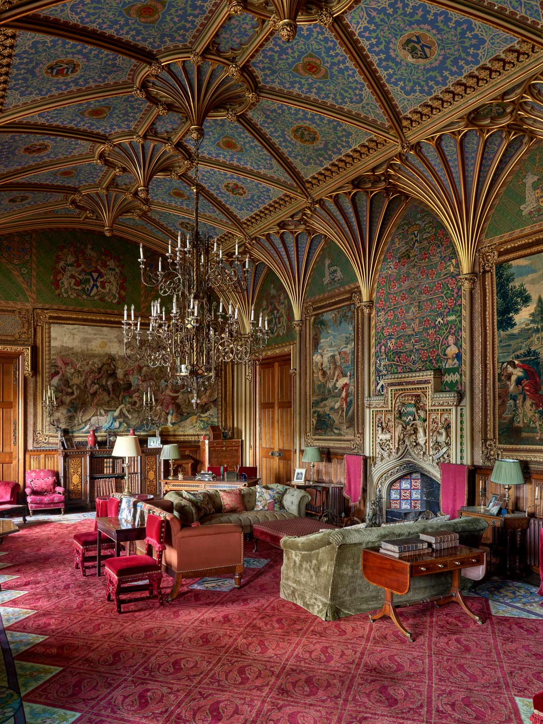 The Gothic Drawing Room at Eastnor Caslte remains largely unchanged from the time when it was redecorated by the Crace brothers to the designs of AW N Pugin in 1849. The seventeenth century Brussels tapestries originally hung in Wimpole Hall and were a wedding present to Lady Caroline Yorke, wife of the second Earl Somers.