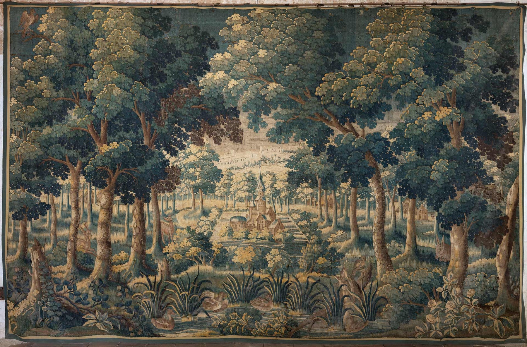 The Jardin d’Ussé Tapestry is a design inspired by a pair of 17th-century verdure tapestries from the private collection of the Château d’Ussé. Woven in Oudenaarde, a Flemish town renowned for its tapestry weaving, this piece celebrates nature’s tranquility and romance. Featuring lush foliage, intricate flowers, and softly rolling plant forms, the Jardin d’Ussé captures the serene charm of a medieval castle nestled within an enchanting dawn landscape. Woodland creatures stir in the early light, evoking a sense of magic and wonder befitting the Château d’Ussé, the French castle said to have inspired Charles Perrault’s Sleeping Beauty.