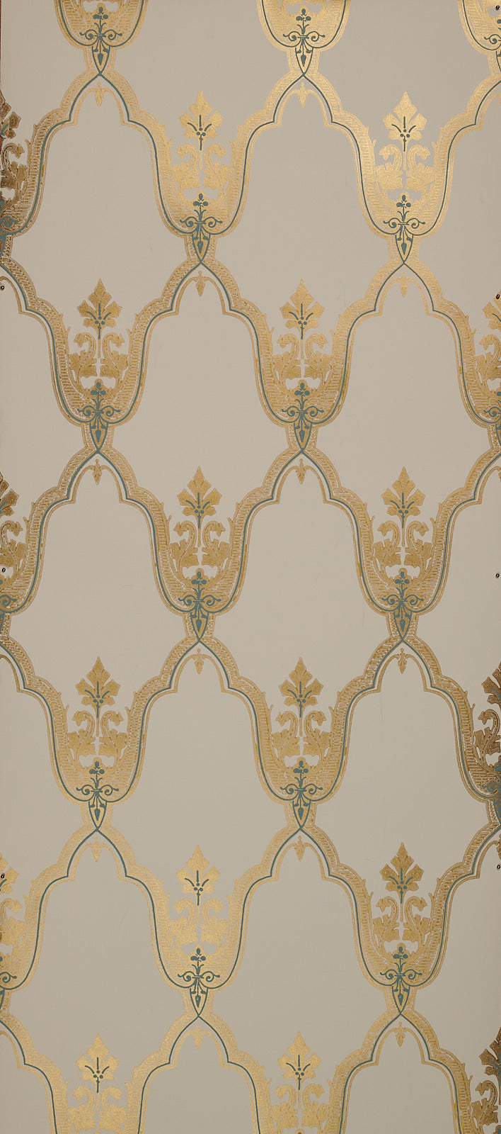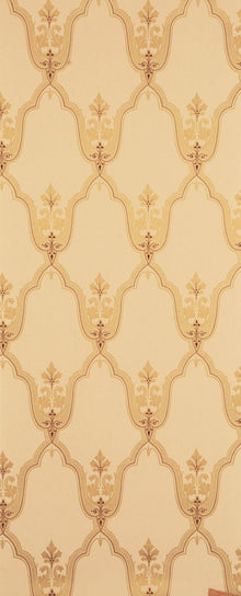 c.1865 the Melias is a fine example of the 'true principles of wallpaper design' as championed in the second half of the nineteenth century in reaction to the predomination of 'bourgeois scrollwork' as seen in designs such as the Oscar. It originally had a warm grey ground, tan trellis and burgundy detail.