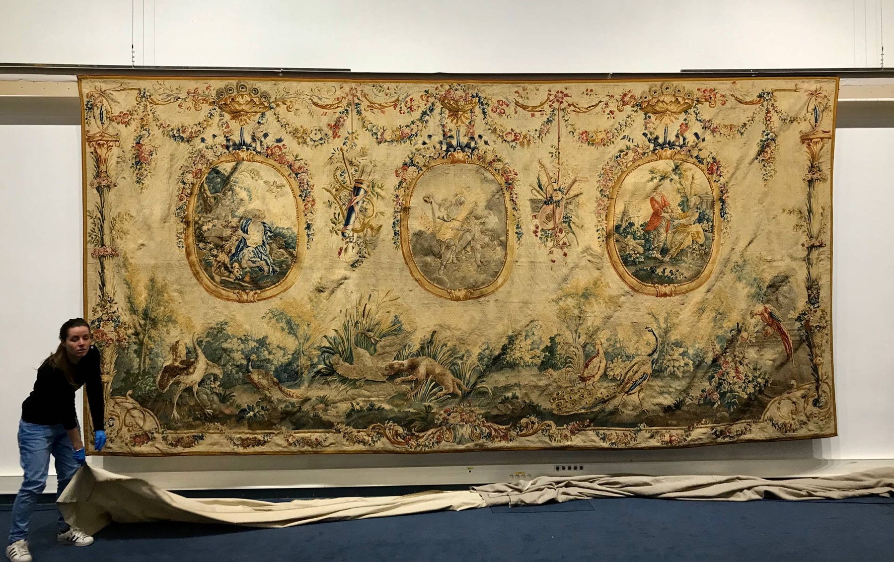 This tapestry genre with animalistic mise en scène is believed to have been inspired by engravings from Jubier. The ‘Pastorale à draperies et arabesques’ presents rural activities in a pastoral mode in the manner of Boucher.