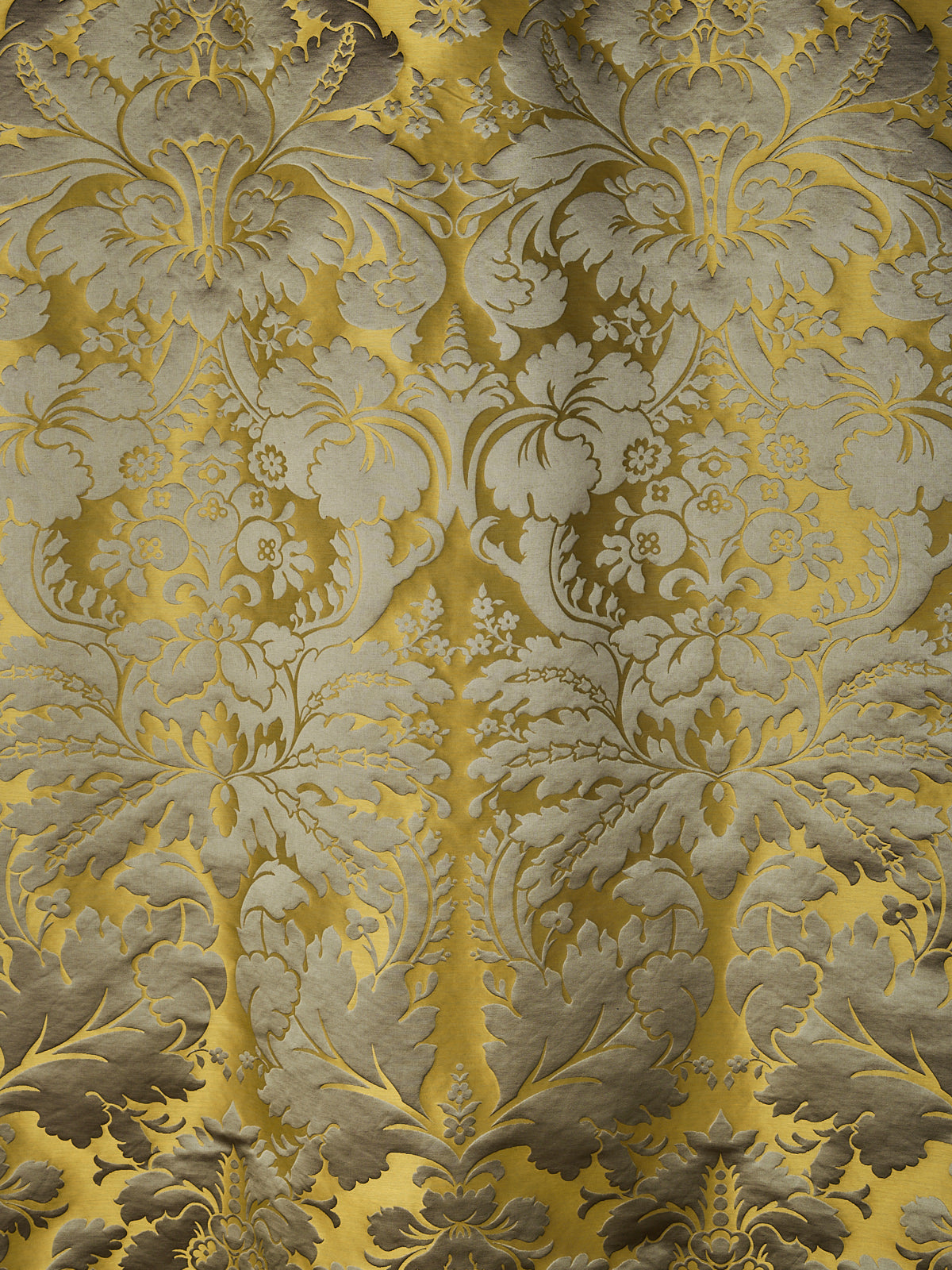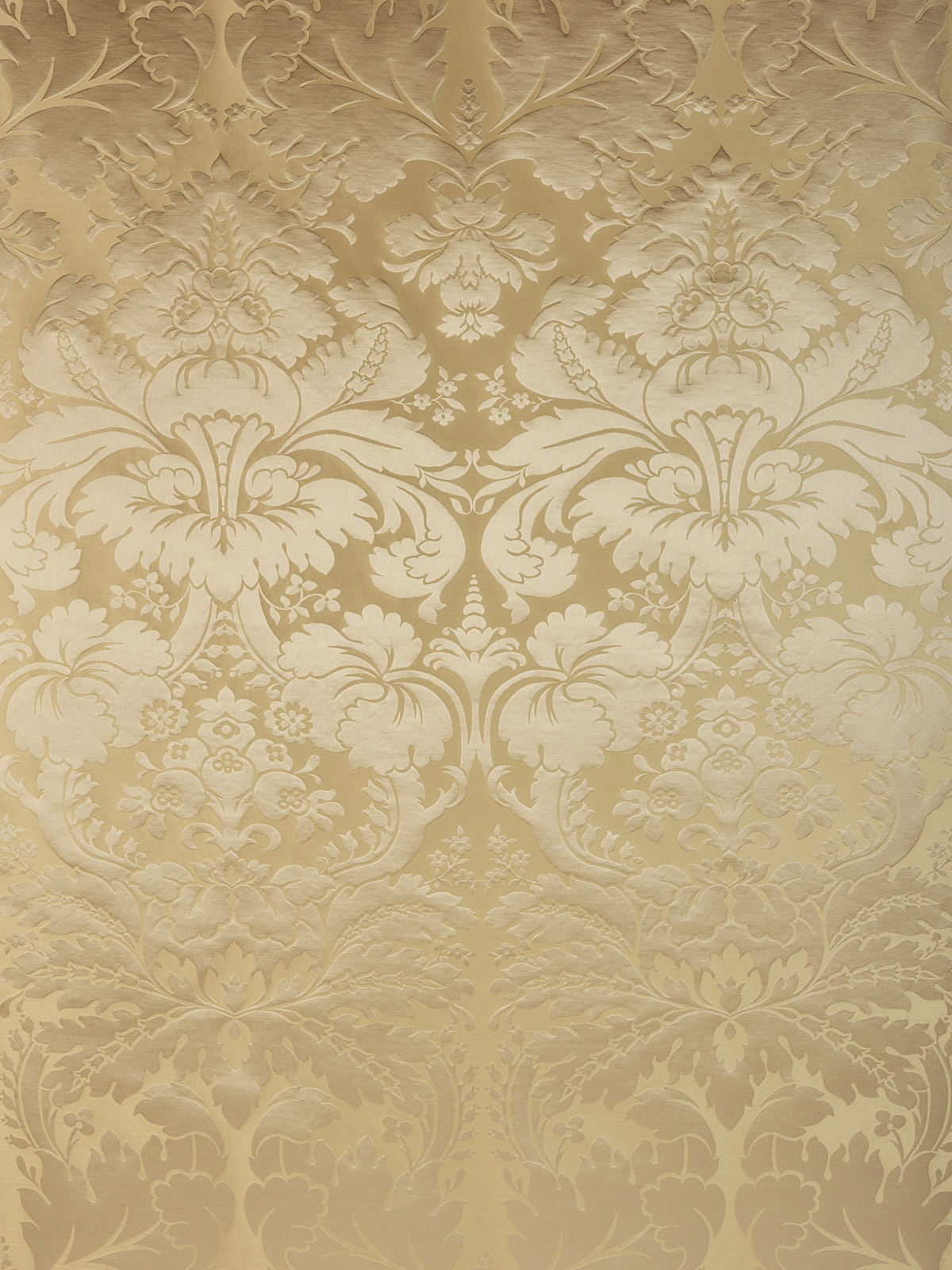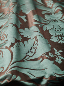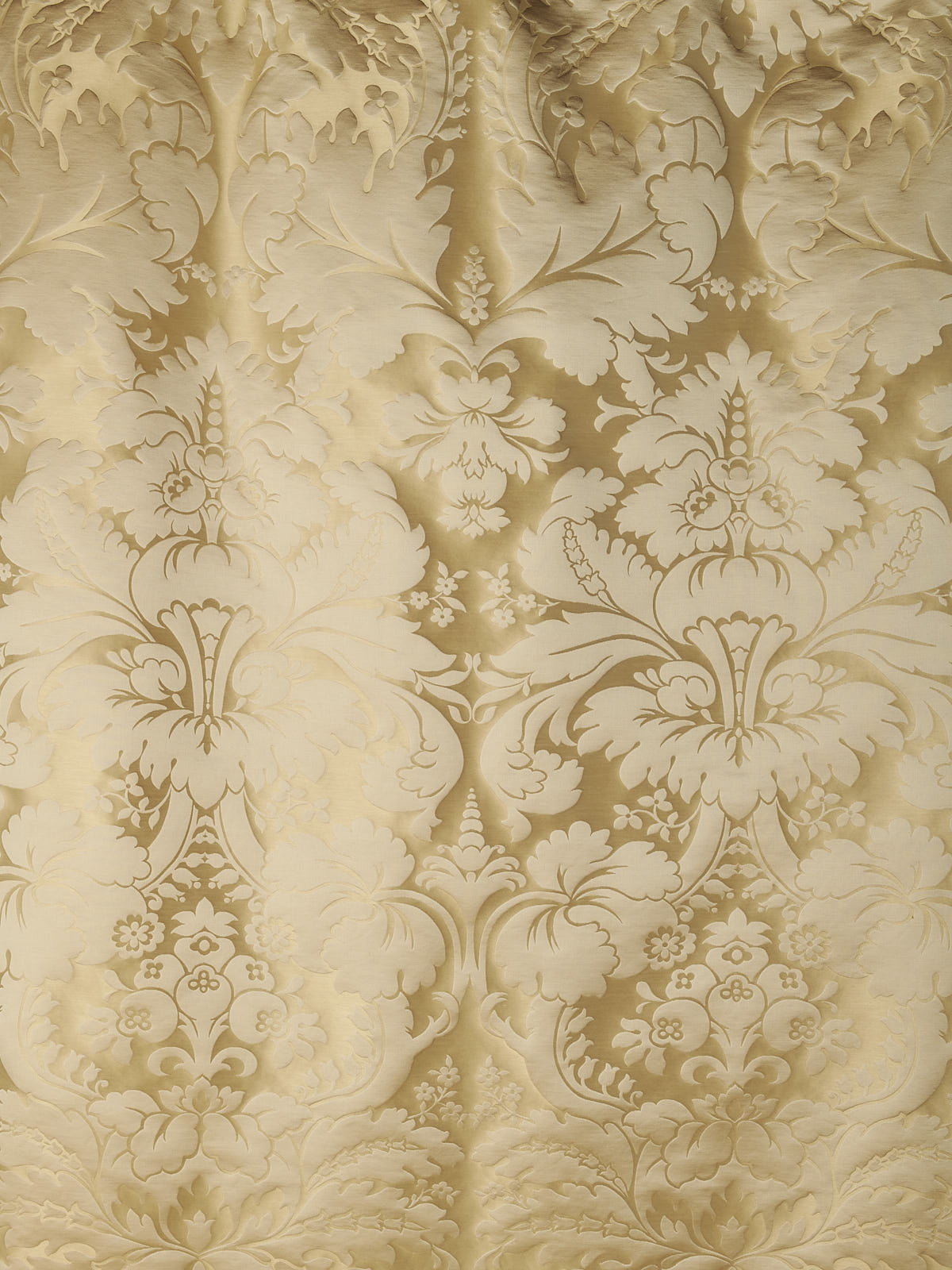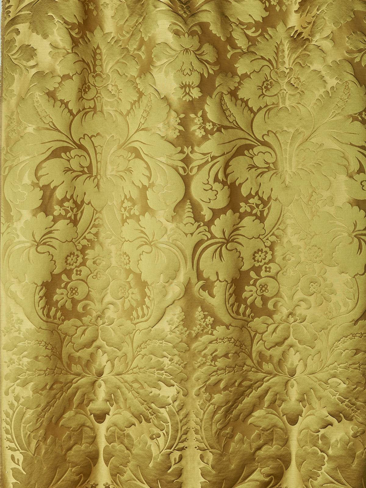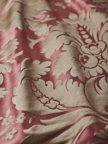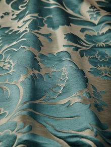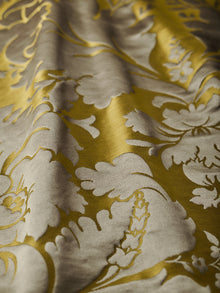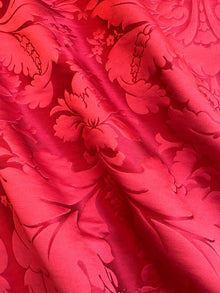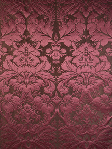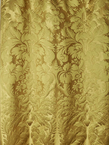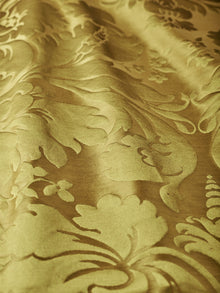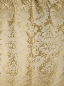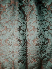 c.1810. This early nineteenth century silk tapestry design has an acanthus leaf motif that was popular in fabrics of this period. The plump leaves bloom in rich colours from the shining ground, appearing almost edible. A brocatelle rather than a damask, the ground is created by the weft, so that the acanthus grows delightfully upwards towards the eye. This fabric is perfect for drapery and upholstery.