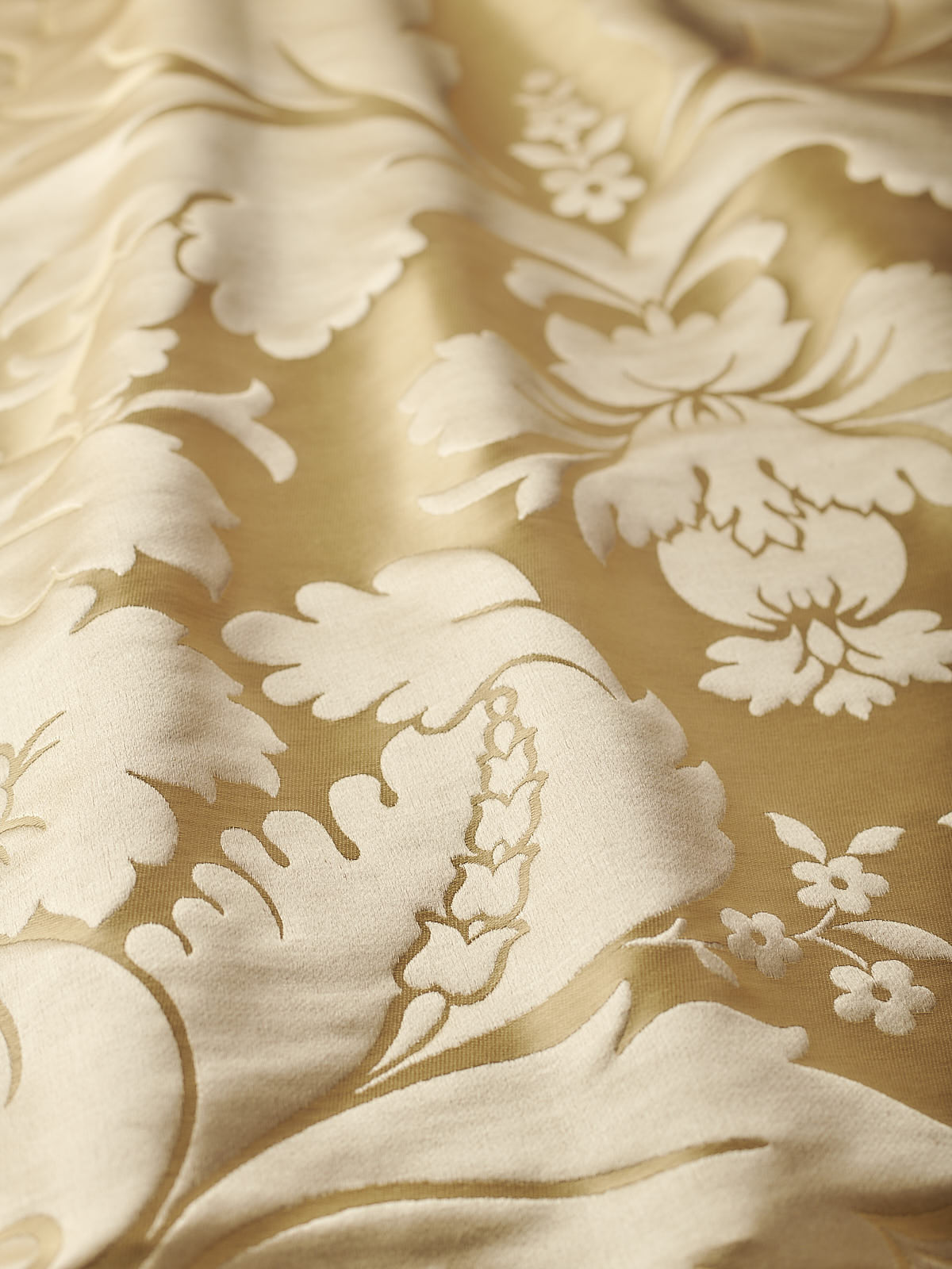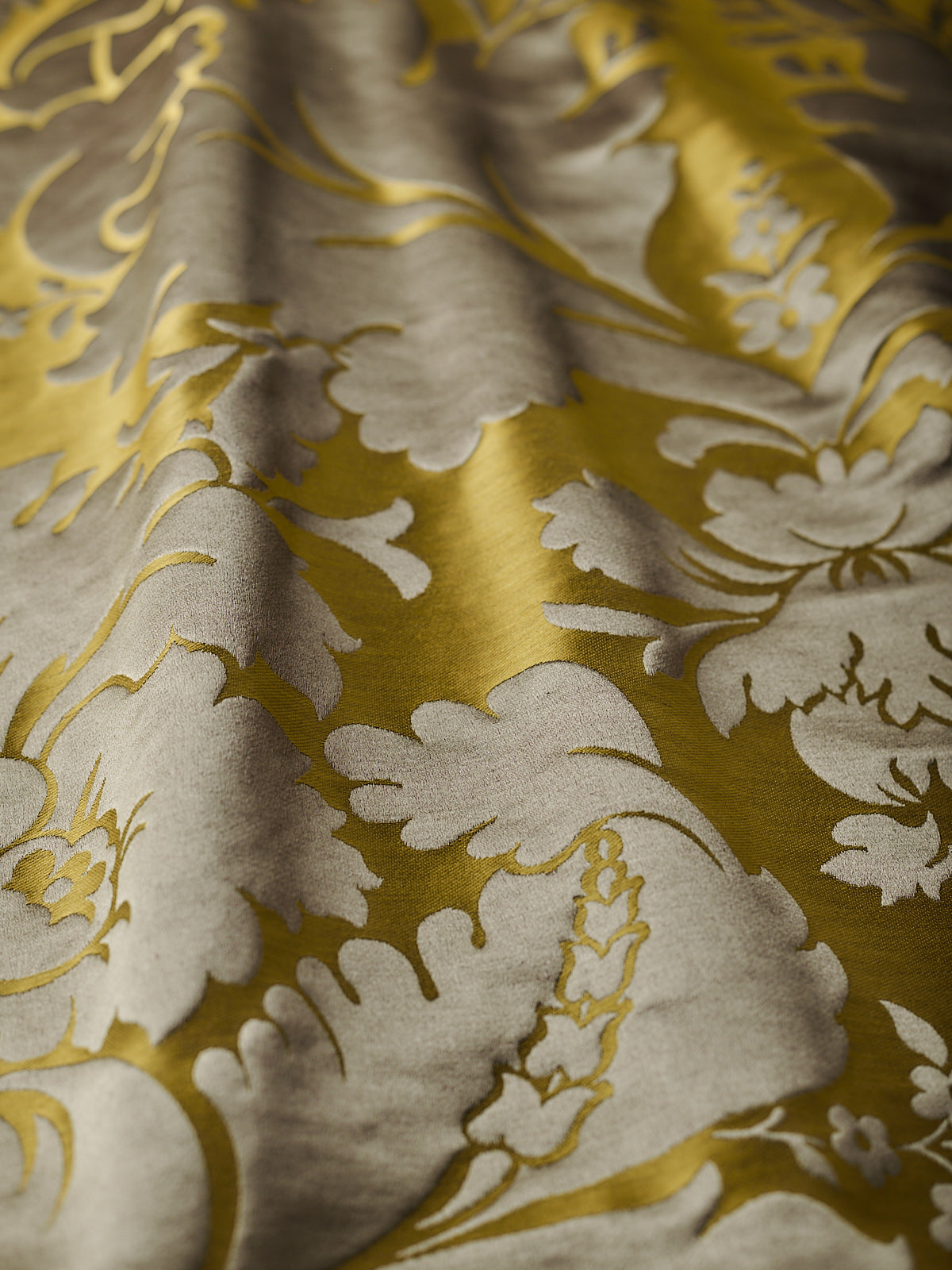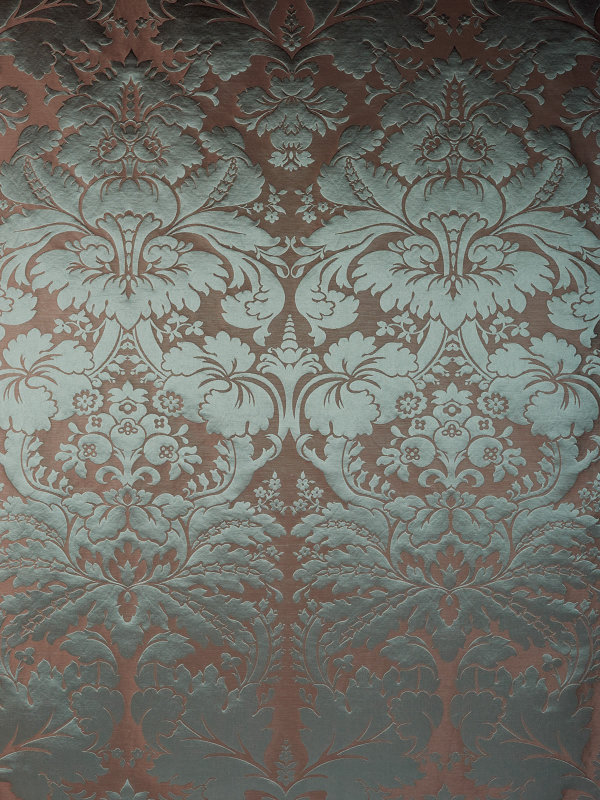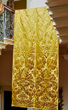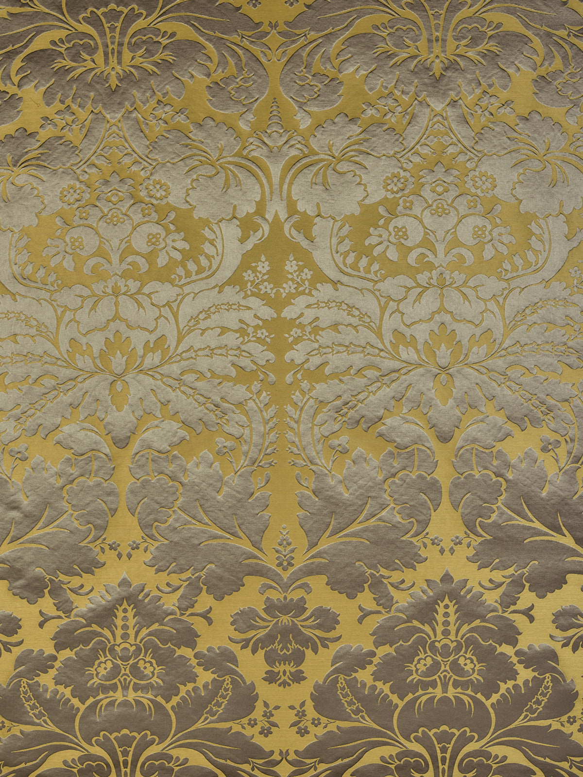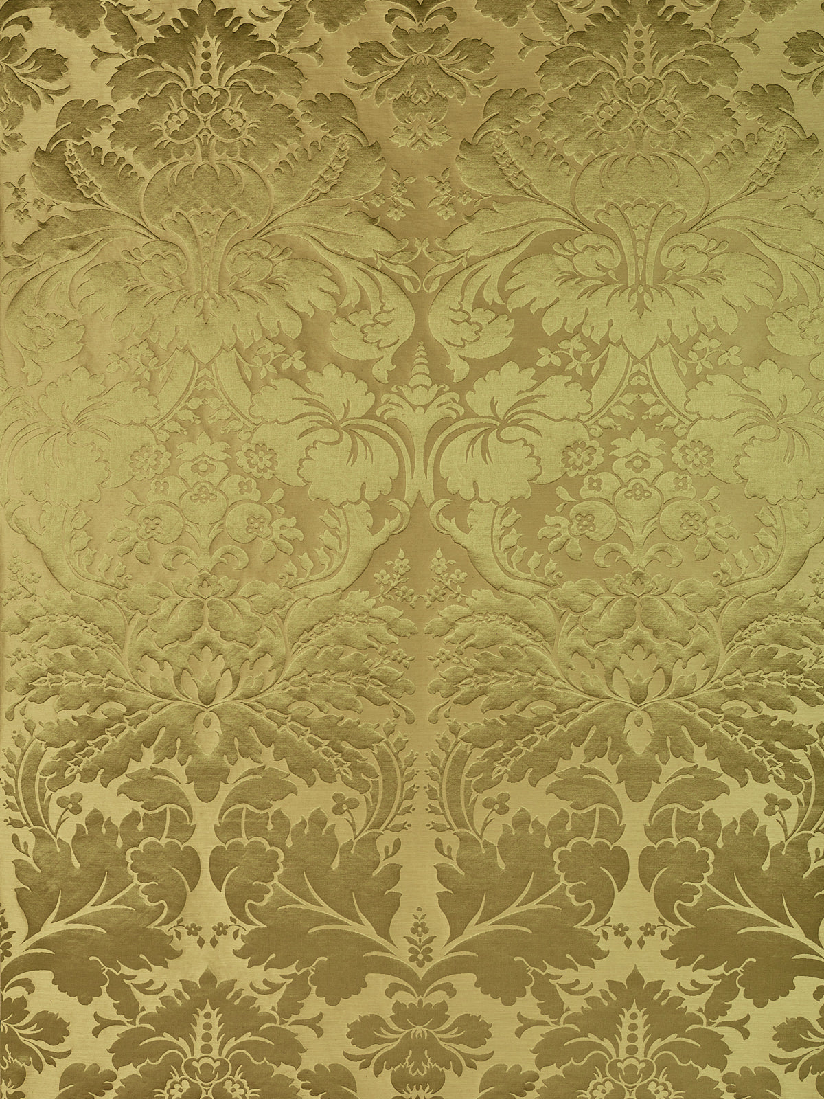 c.1810. This early nineteenth century silk tapestry design has an acanthus leaf motif that was popular in fabrics of this period. The plump leaves bloom in rich colours from the shining ground, appearing almost edible. A brocatelle rather than a damask, the ground is created by the weft, so that the acanthus grows delightfully upwards towards the eye. This fabric is perfect for drapery and upholstery.