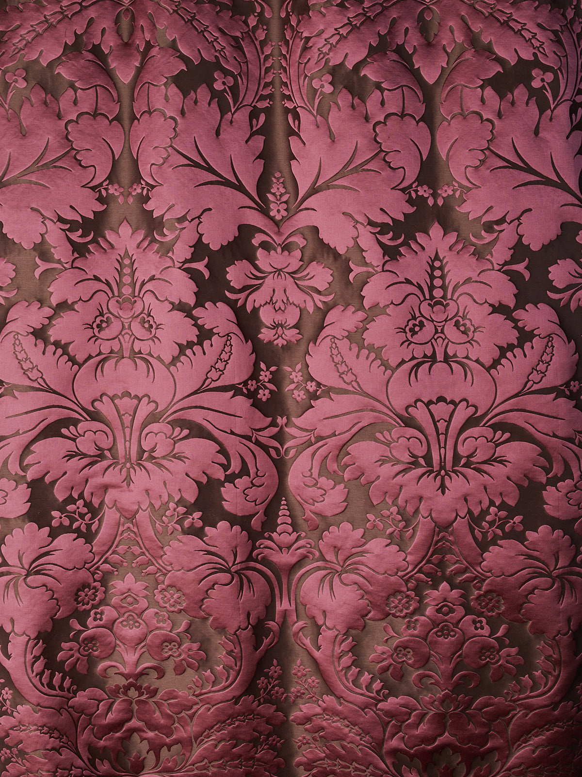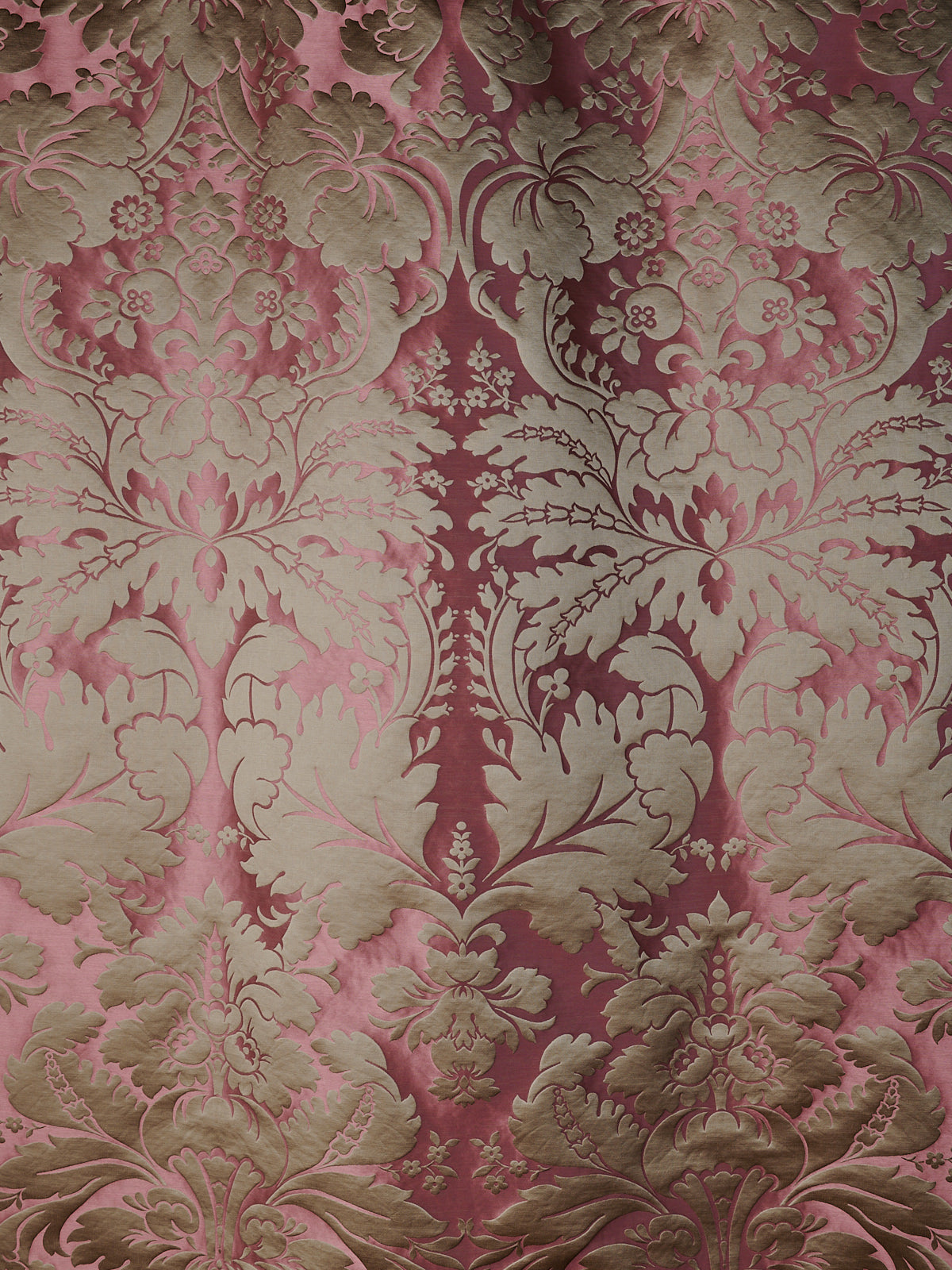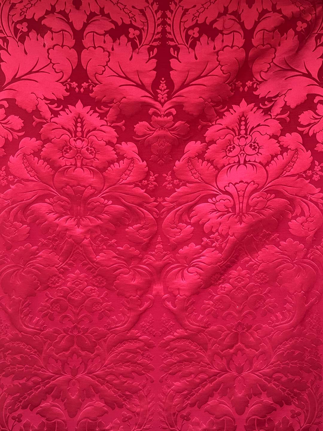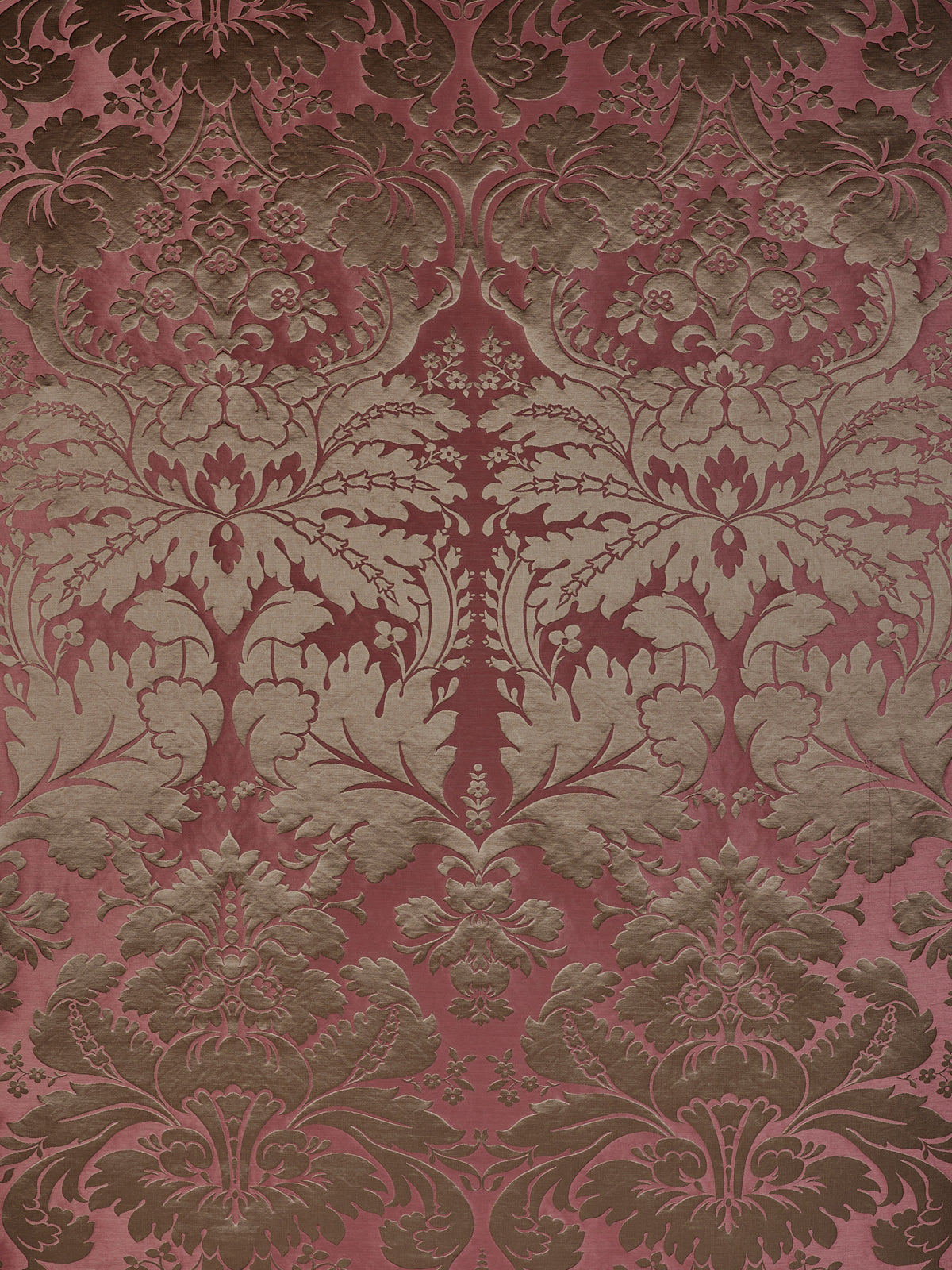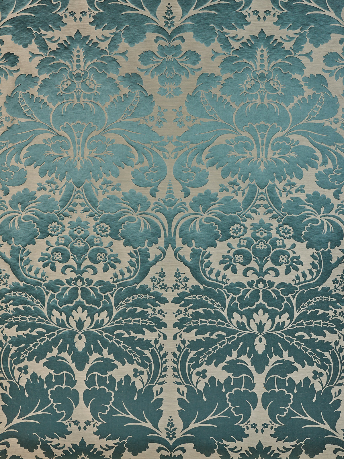 c.1810. This early nineteenth century silk tapestry design has an acanthus leaf motif that was popular in fabrics of this period. The plump leaves bloom in rich colours from the shining ground, appearing almost edible. A brocatelle rather than a damask, the ground is created by the weft, so that the acanthus grows delightfully upwards towards the eye. This fabric is perfect for drapery and upholstery.