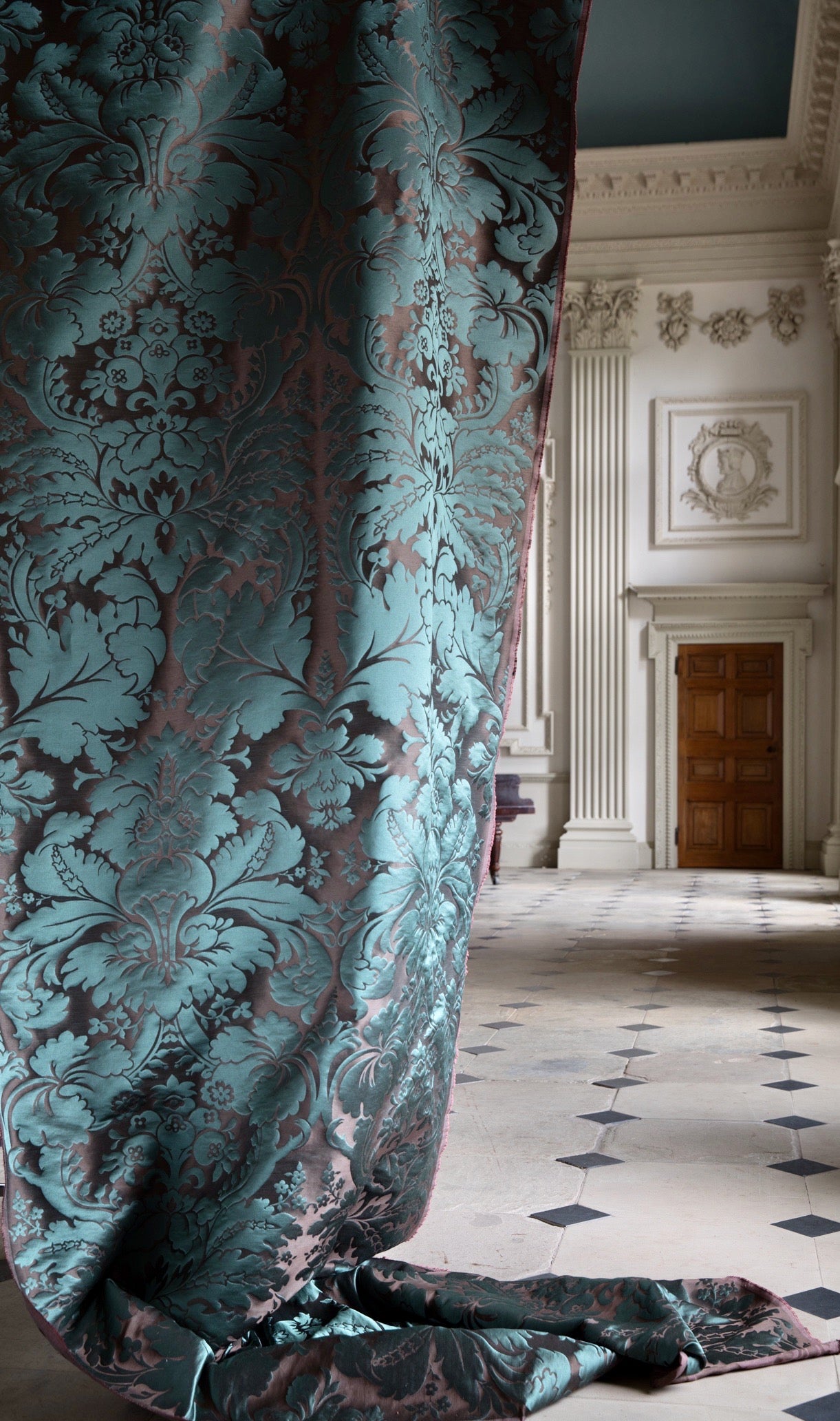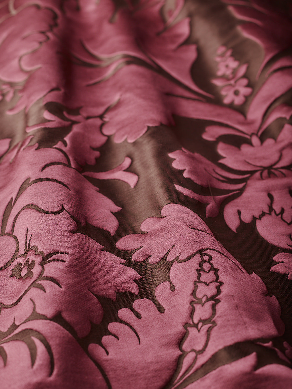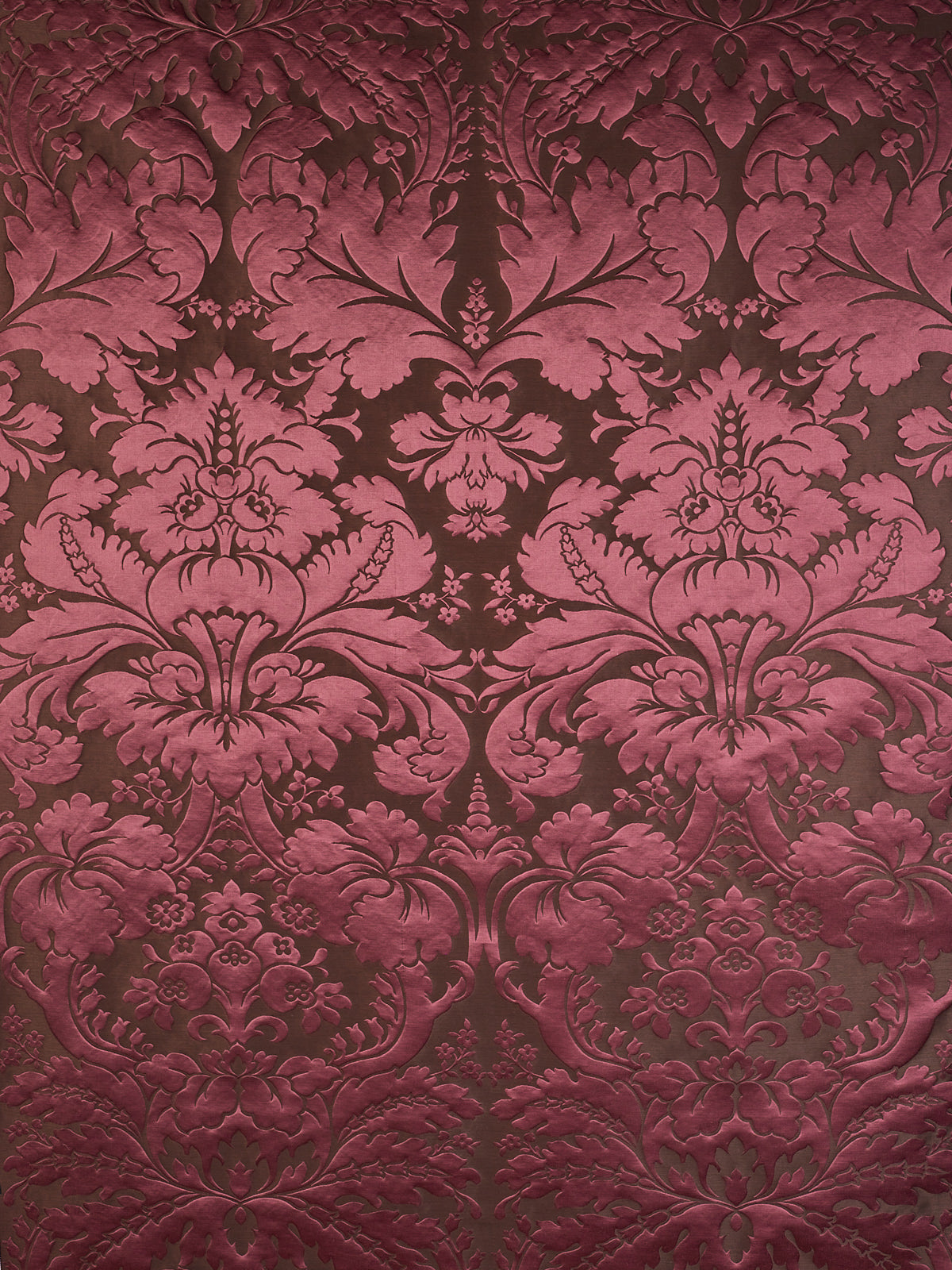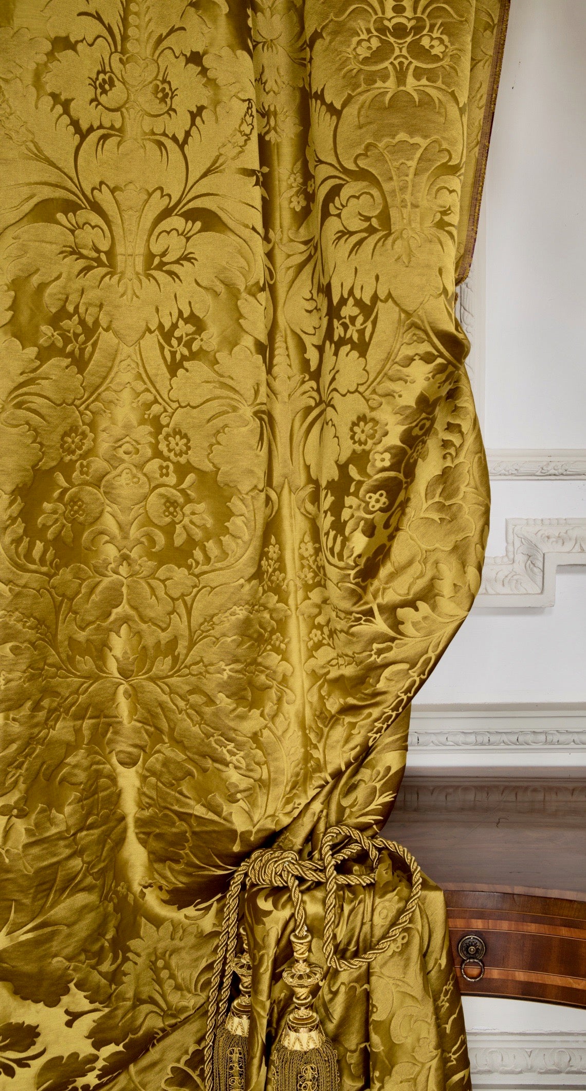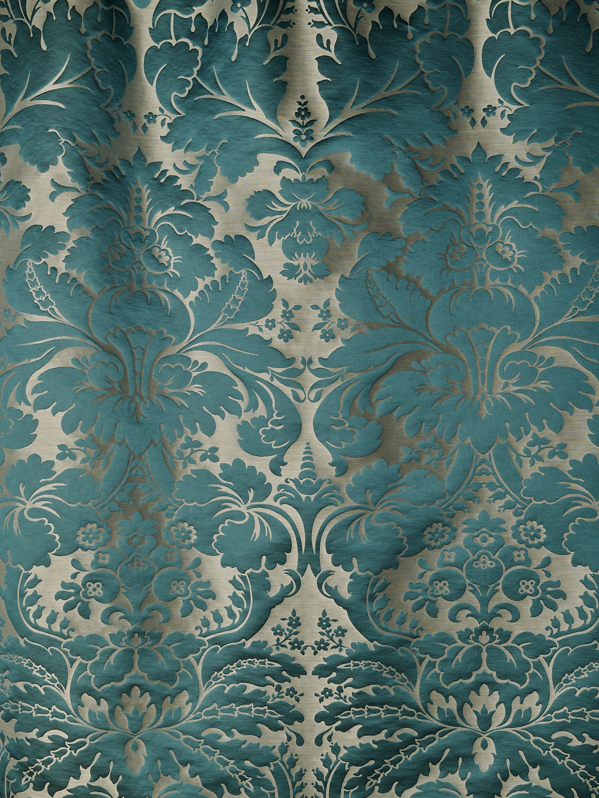c.1810. This early nineteenth century silk tapestry design has an acanthus leaf motif that was popular in fabrics of this period. The plump leaves bloom in rich colours from the shining ground, appearing almost edible. A brocatelle rather than a damask, the ground is created by the weft, so that the acanthus grows delightfully upwards towards the eye. This fabric is perfect for drapery and upholstery.