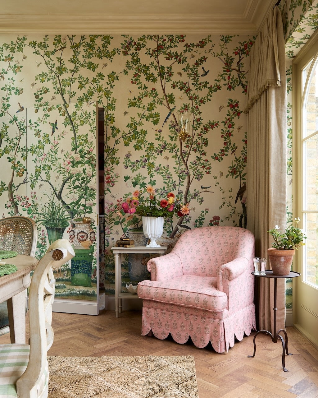 Ussé Chinoiserie depicts an astonishing botanical array, myriad leaf formations dance between elegant, patterned urns. The hand painted original paper still adorns the languid walls of Château d’Ussé, the French castle which inspired Sleeping Beauty. This is a truly authentic example of 18th century hand painted Chinoiserie.