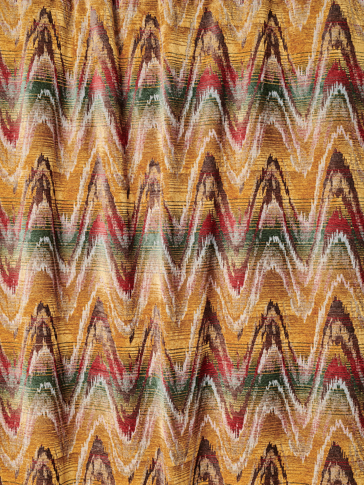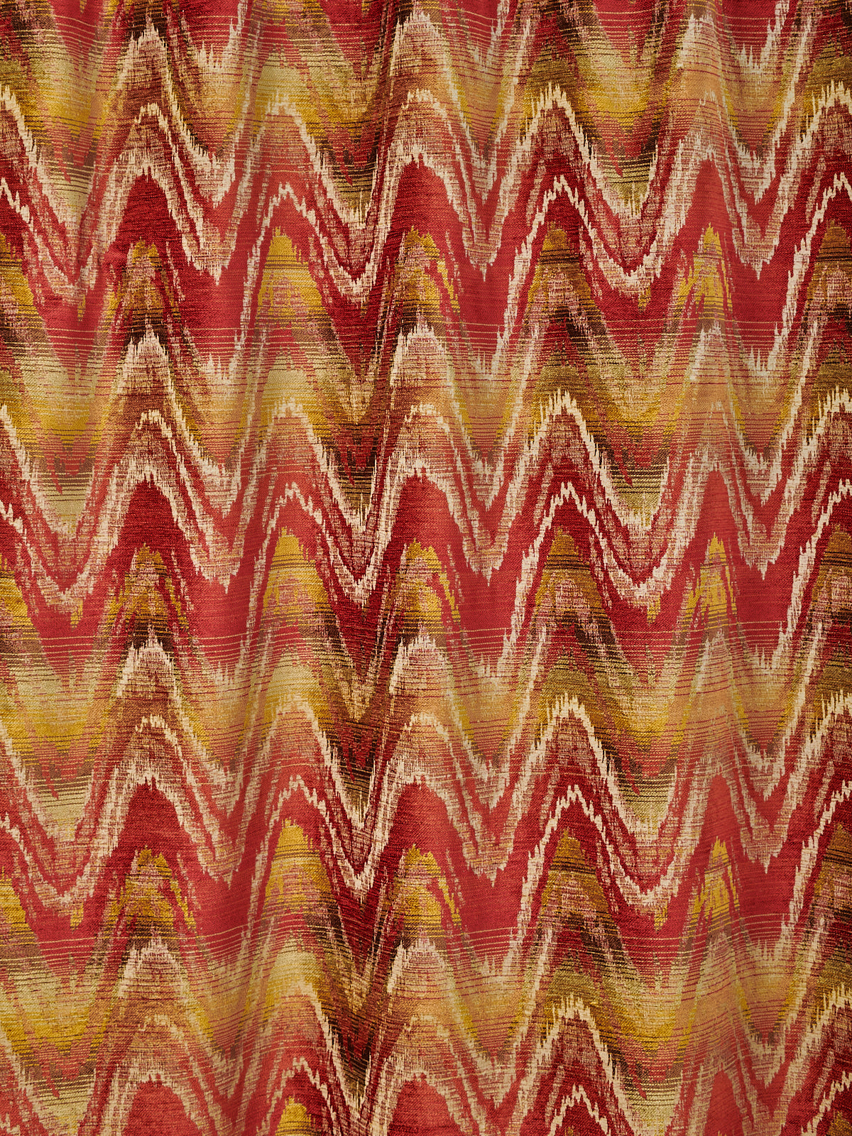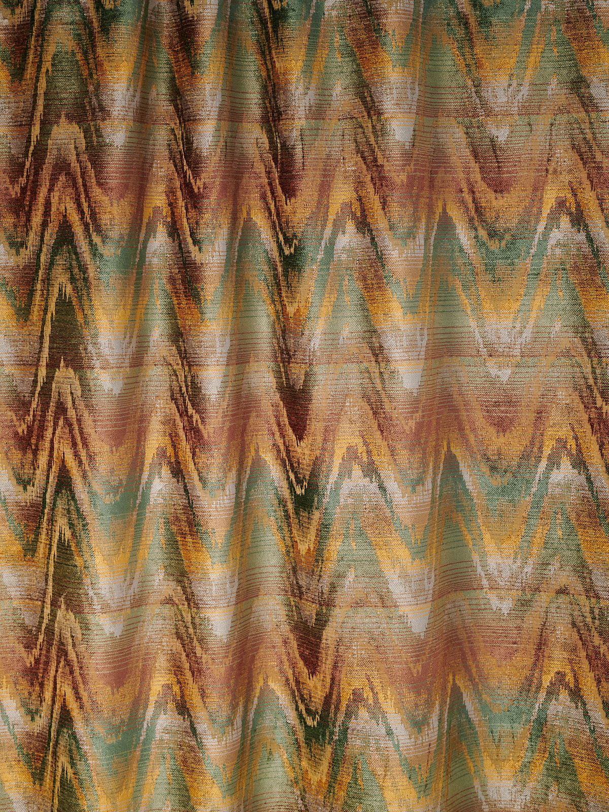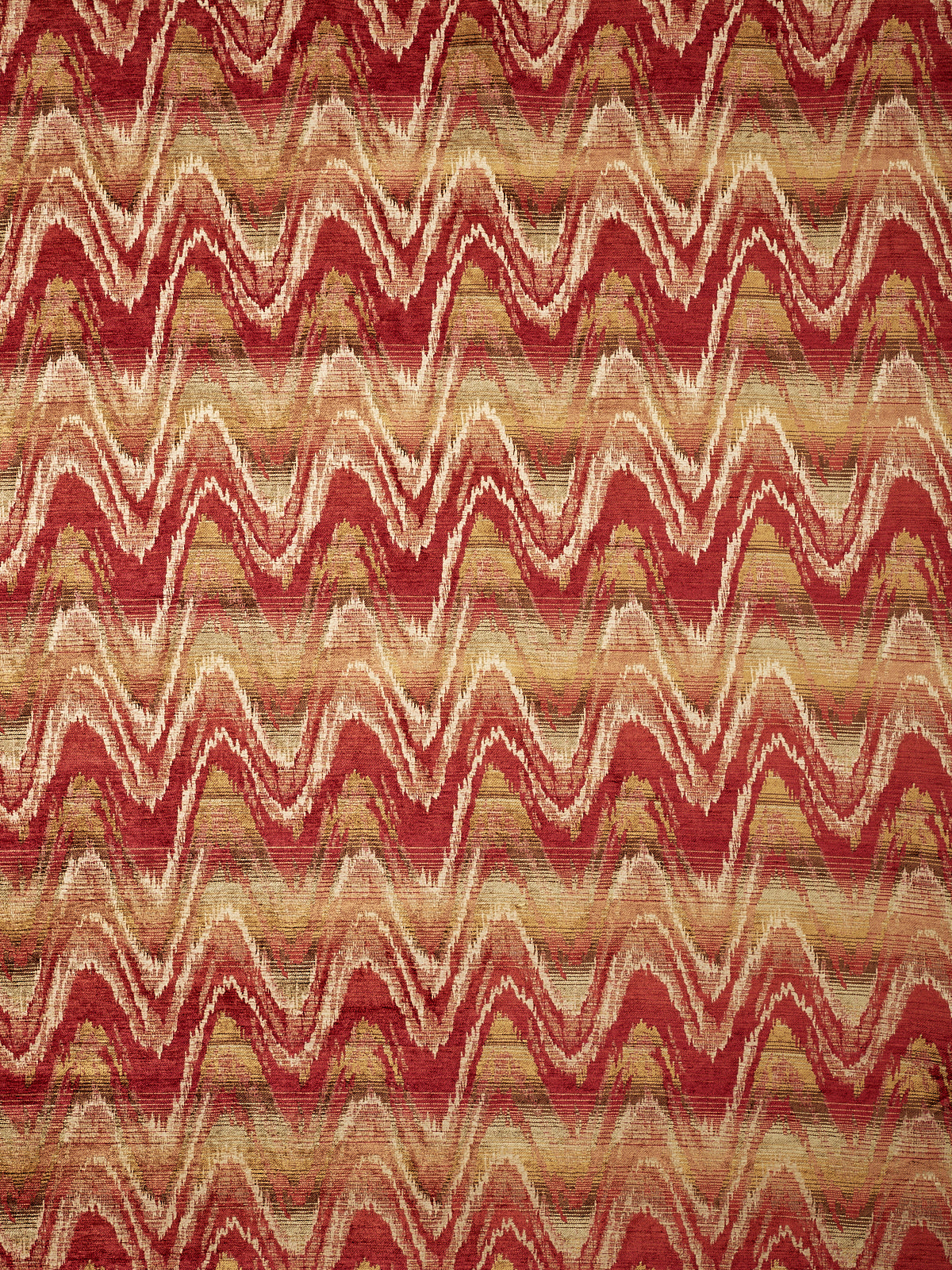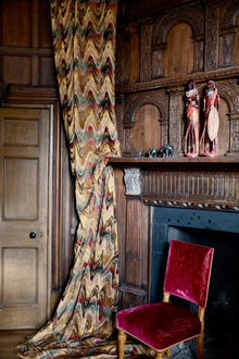 A more meandering iteration of the Bargello flamestitch, Zardozi’s rolling zigzag paints the interior with gentle undulations of colour. Watts 1874 Stone Washed Chenilles are supple, substantial textiles, ideal for both upholstery and drapery.