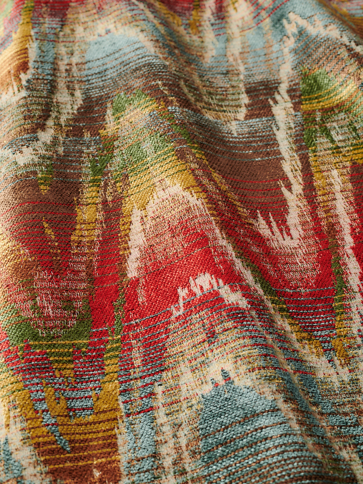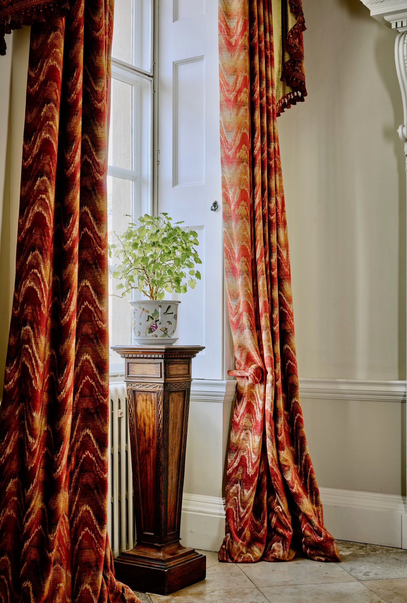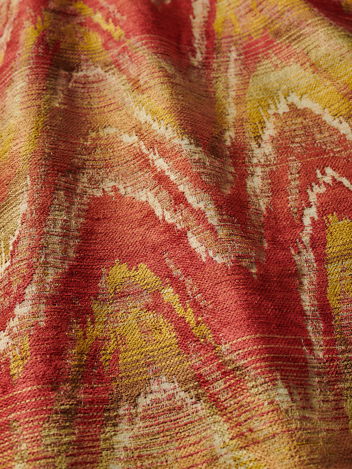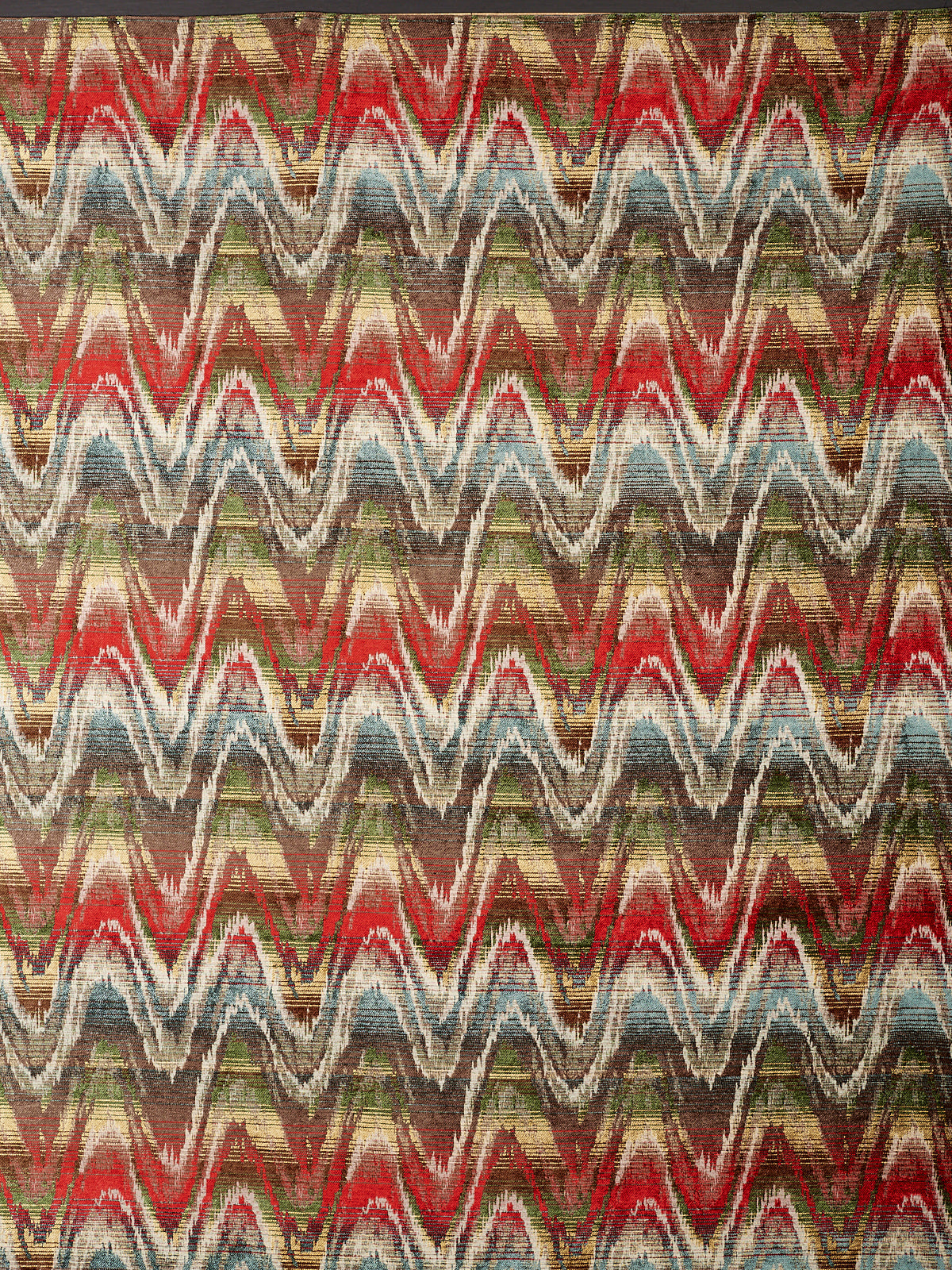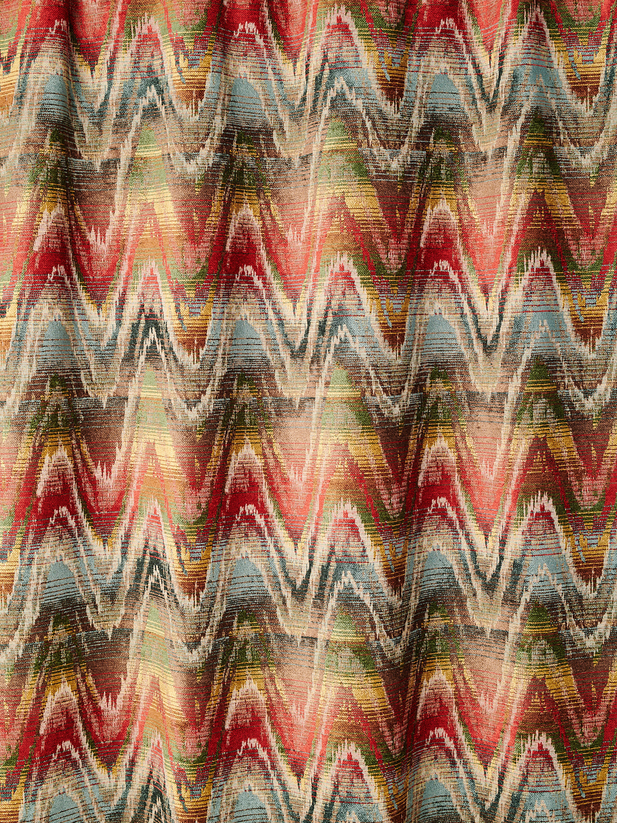 A more meandering iteration of the Bargello flamestitch, Zardozi’s rolling zigzag paints the interior with gentle undulations of colour. Watts 1874 Stone Washed Chenilles are supple, substantial textiles, ideal for both upholstery and drapery.